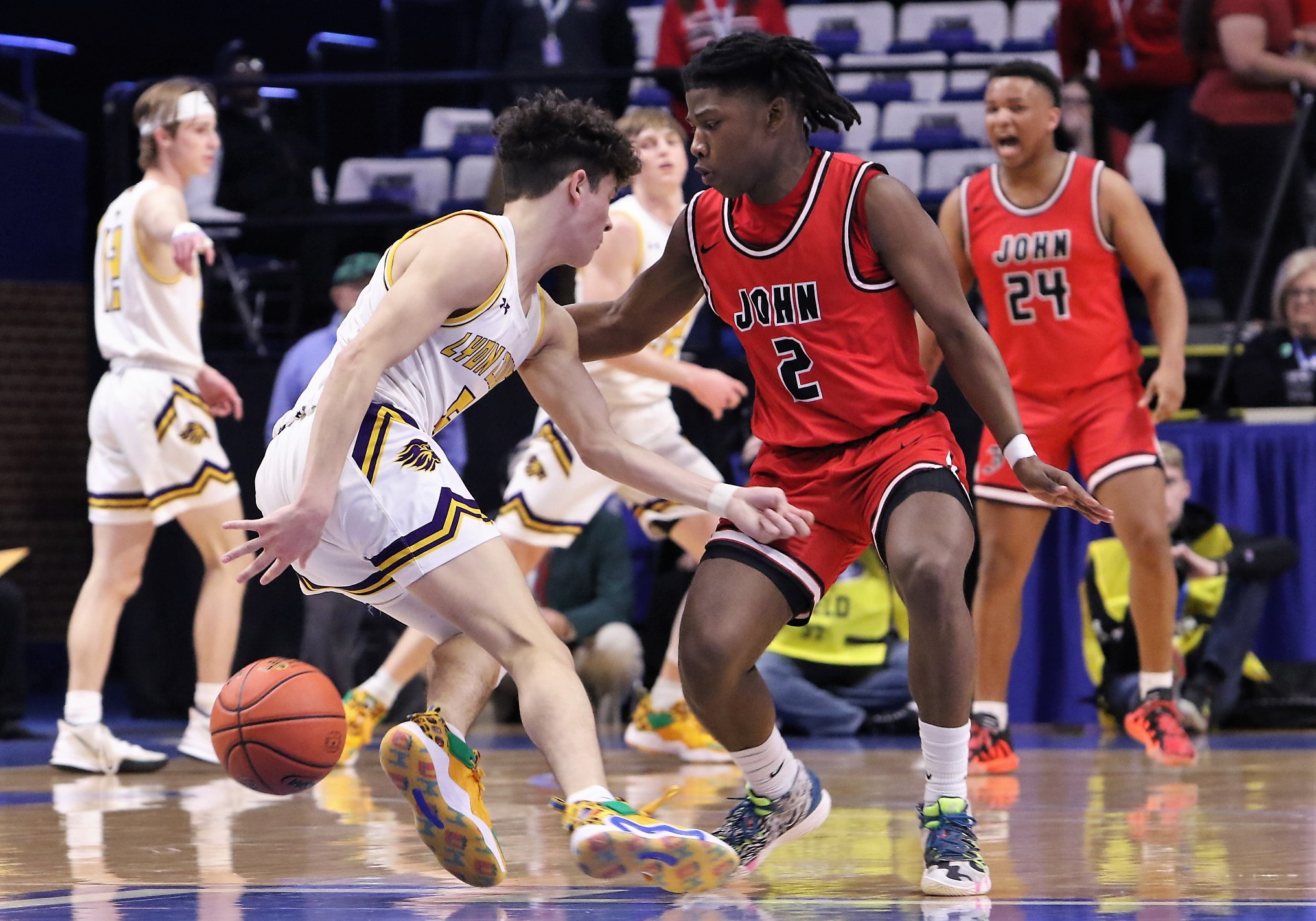 The Lyons came out in a 2-3 zone to slow down the Bulldogs and John Hardin responded by hitting several long-range shots building a 20-11 lead midway through the first quarter. The Lyons, who like the Bulldogs are a run and gun team, responded by adjusting slowly cutting the lead to 20-15 after one. John Hardin continued to lead through the second and held a 36-35 halftime lead.